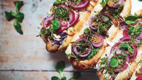 Top med masser af ristede løg, syltede rødløg og syltede sennepsfrø og drys til sidst med karse.