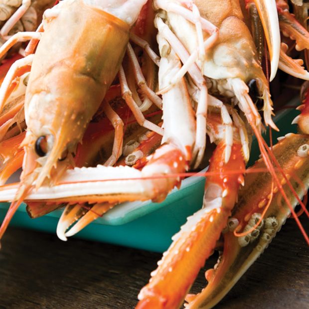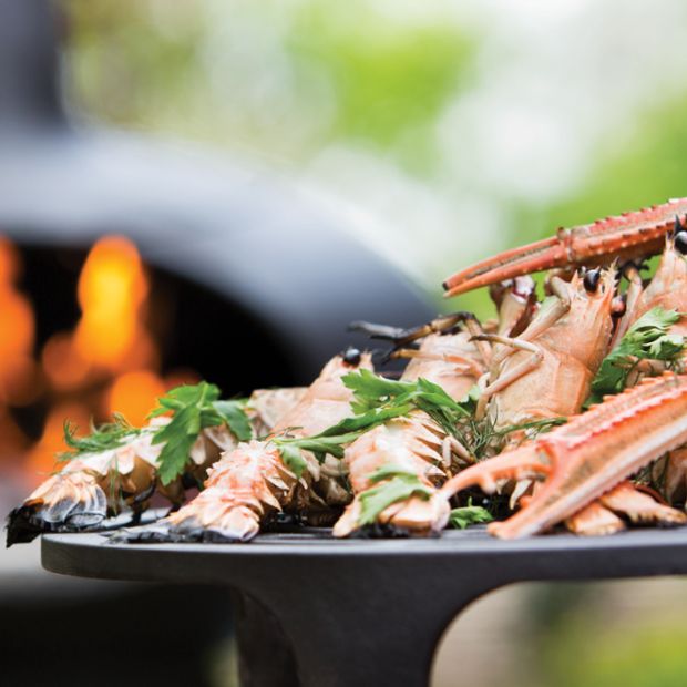 Grillede jomfruhummere med bisque, glaskål og parmesancroutoner