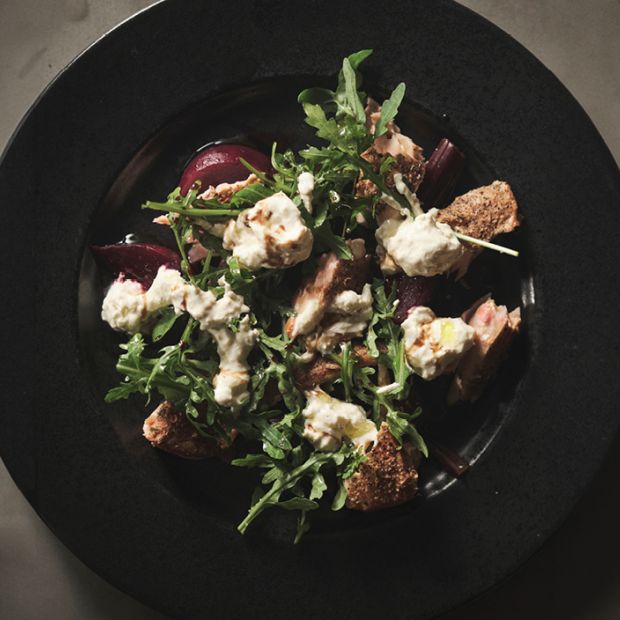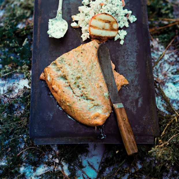 Rimmet lynbagt laks med æble-hytteost-urte-salat