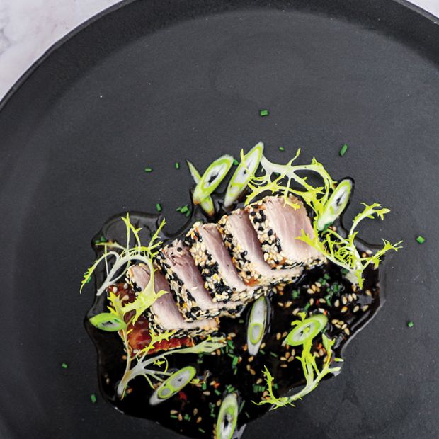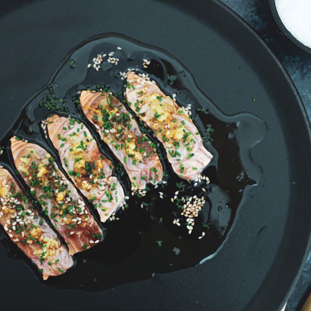 Lakse sashimi med med frisk ingefær, hvidløg og sesamolie