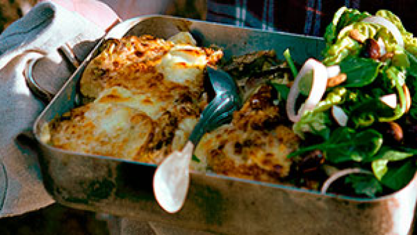 Fyld de tomme aubergineskaller med blandingen, stil dem i ovnen og bag i 8 min. ved 250 grader, til de er let gyldne på overfalden.