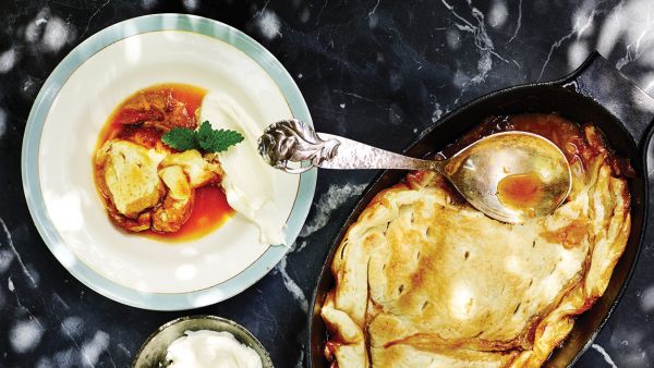 Når tærten er gylden og sprød på toppen, er den færdig og klar til servering sammen med mascarponecremen. Pynt med jernurt eller mynte som smager herligt til den fede creme og de syrligtsøde rabarber.