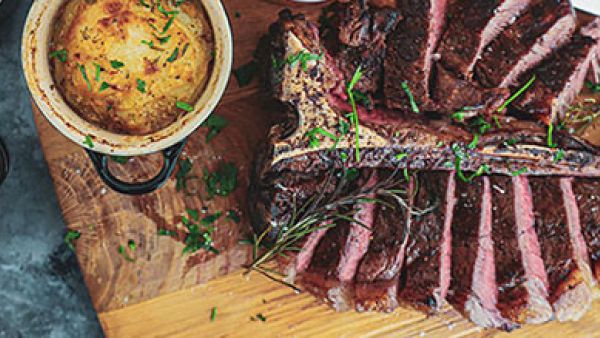 - Skær bøfferne ud ved at skære kødet fra benene, og skær derefter hvert af disse stykker ud i skiver. Placer skiverne op af benene og server dem på et spækbræt sammen med bearnaisesaucen og de portionsanrettede kartofler.