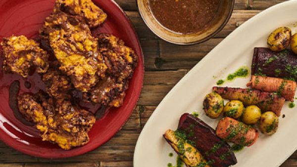 Grillede Hasselback rodfrugter med friterede kyllingelår