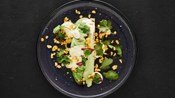 Placér spidskålen på fire tallerkner. Skær majskerner af kolben, og drys ud over spidskålen. Pres limesaft ud over spidskålen, og krydr med salt og peber. Kom 1 spsk. sourcream over hvert stykke spidskål. Drys med hakket chili, og dryp med olivenolie.