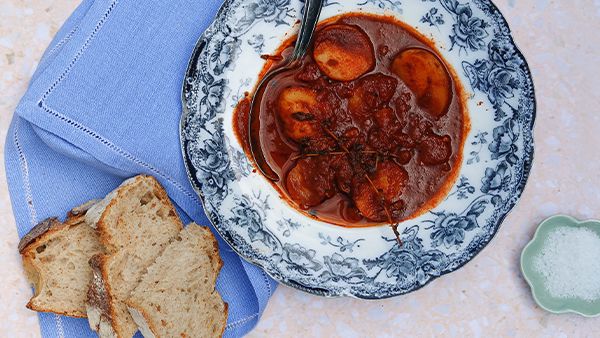 En simreret, der samler alle omkring gryden og fylder luften med varme krydderier og ren hygge. De små kartofler trækker smag fra røget paprika og tomater, mens frisk timian giver et let, grønt pift. En enkel, hjemlig ret med plads til gode samtaler og lange sommeraftener ved bålet.