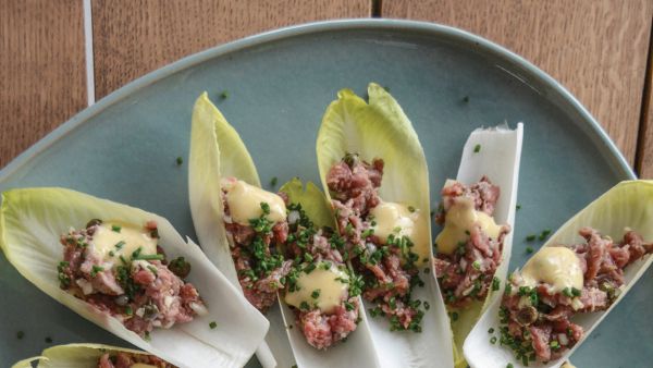 Skær bunden af julesalaten og bræk bladene af, et efter et. Arranger dem på et fad. Kom en smule tatar i hvert blad, top op med mayonnaise og finthakket purløg.