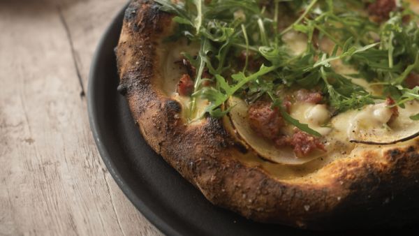 - Når pizzaen er bagt, kom lidt rucola på pizzaen og dryp med god olivenolie.