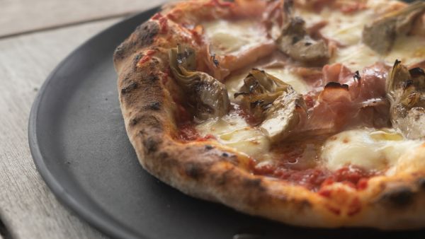 Påfør tomatsaucen og kom topping på. Drys lidt durum mel på din pizzaspade og skub den forsigtigt ind under pizzaen. Placer pizzaen midt i Forno Spin og tænd for rotationen. Bag i 1 – 1 1/2 minut.