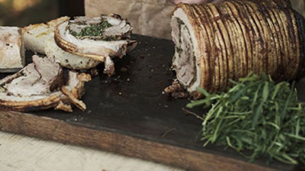 Grill porchetta’en i 2 timer på lav varme og derefter en time på medium varme.