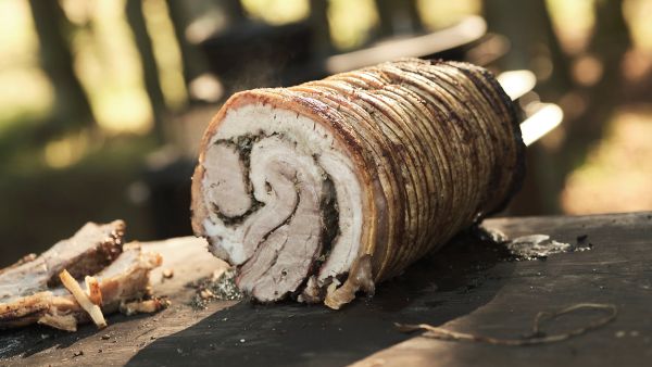 Sprød, saftig og virkelig lækker porchetta, tilberedt på rotisseri på grillen