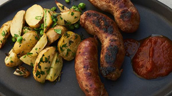 Grill pølserne og server med rosmarinkartofler og ketchup.