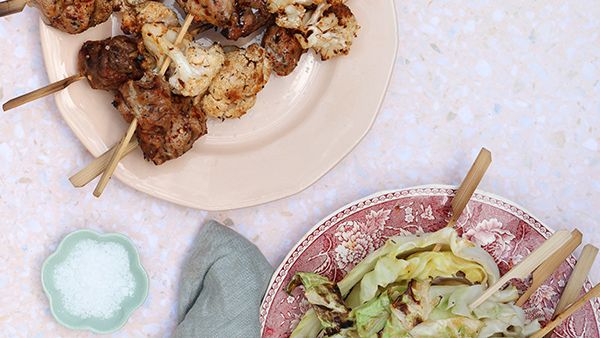 Del blomkålen i lige store buketter, og skær spidskålen i store, grove både. Træk på pinde og pensl med olieblandingen. Sæt nu også kødternene på spyd. Steg over bål, indtil det er let brunet og kødet gennemstegt.