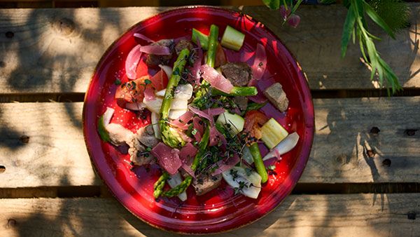 Tag Roast Pan op af grillen, vend det hele rundt. Og server med det samme, evt. med lidt syltede løg.