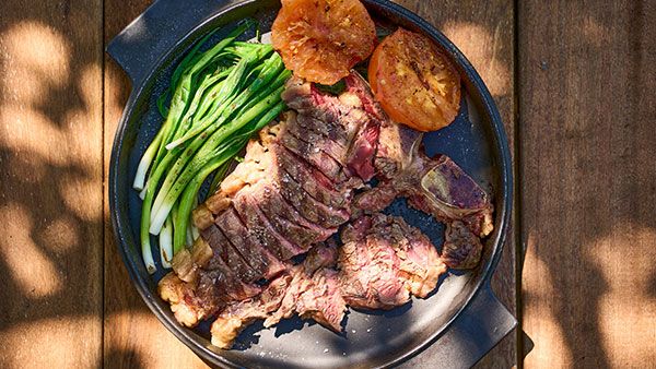 T-bone steak med årstidens grønt