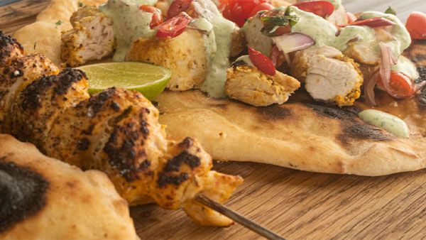 Server kyllingespyddene på Naan brød med grofthakkede cherrytomater, fintsnittet rødløg og korianderyoghurt.