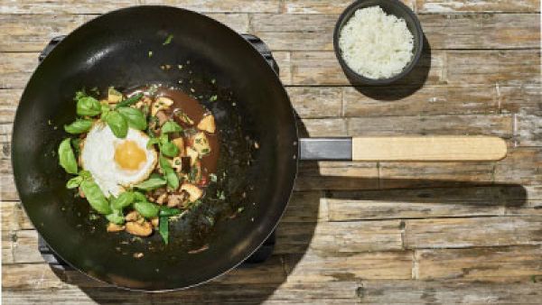 Det er vigtigt, at du har alt klar, inden du begynder! Varm wokken op ved høj varme, steg hvidløg og chili af i 10-15 sekunder i 5 spsk olie, inden kødet steges med. Når kødet er 2/3 færdig steges bønner og basilikum (gem lidt af basilikum til pynt) med og saucen tilføres. Steges godt af ved høj varme i et par minutter.