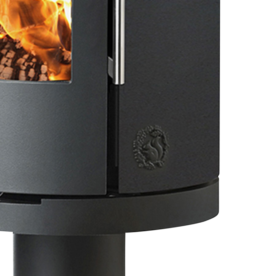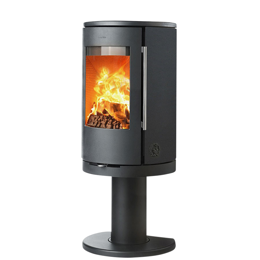 Morsø 7349 en brændeovn, der rejser sig elegant på den runde piedestal. Det spektakulære flammebillede sætter markant præg på omgivelserne og piedestalen giver ovnen et let og svævende udtryk.