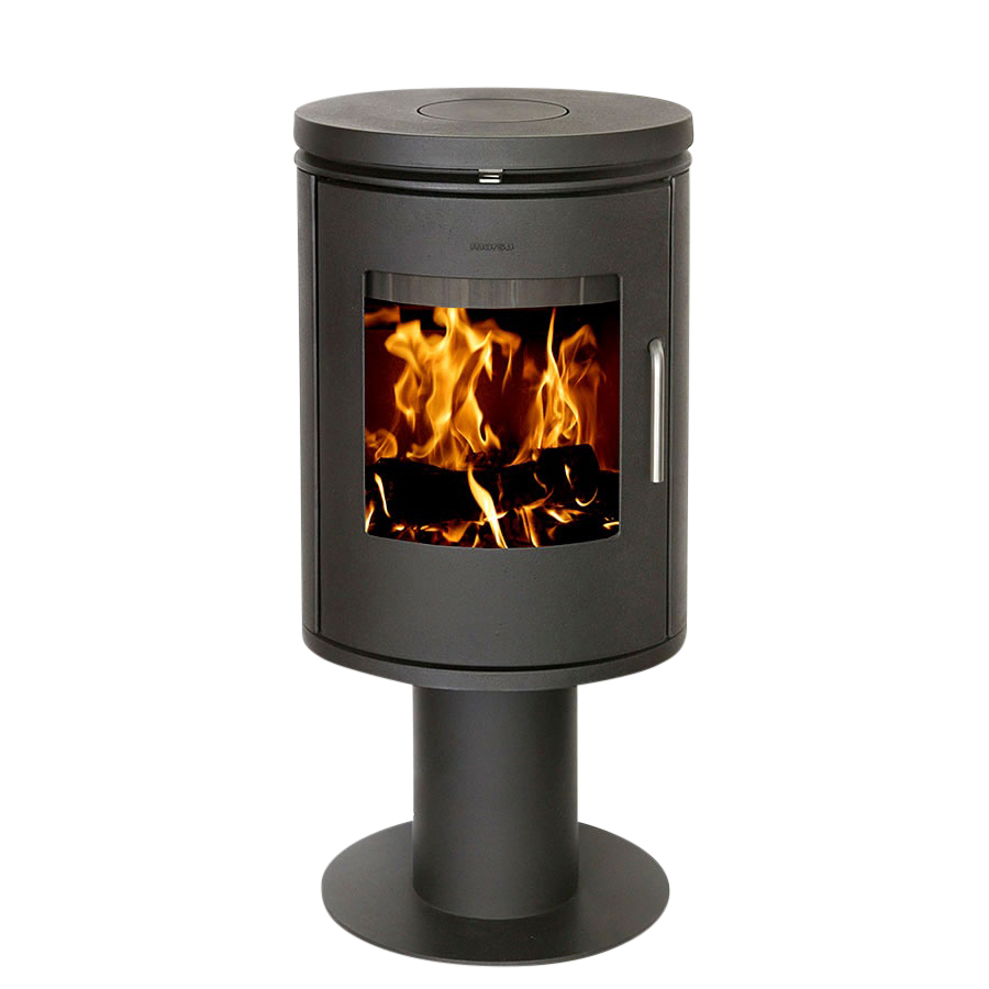 Morsø brændeovn 6148 står som en smuk skulptur i støbejern på sin piedestal. En ovn, som i sit design er tidløs og minimalistisk, og den store glaslåge giver fuldt udsyn til de dansende flammer.