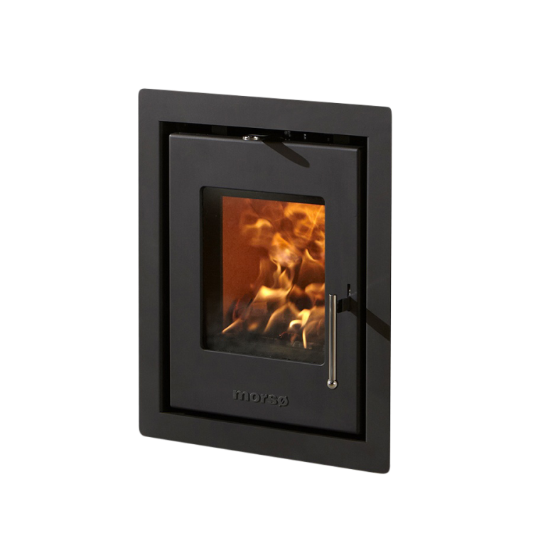 Ovndøren er i den kendte Morsø kvalitetsstøbejern, mens den omkransende ramme kan fås i mørk antracit gråt eller børstet stål.
