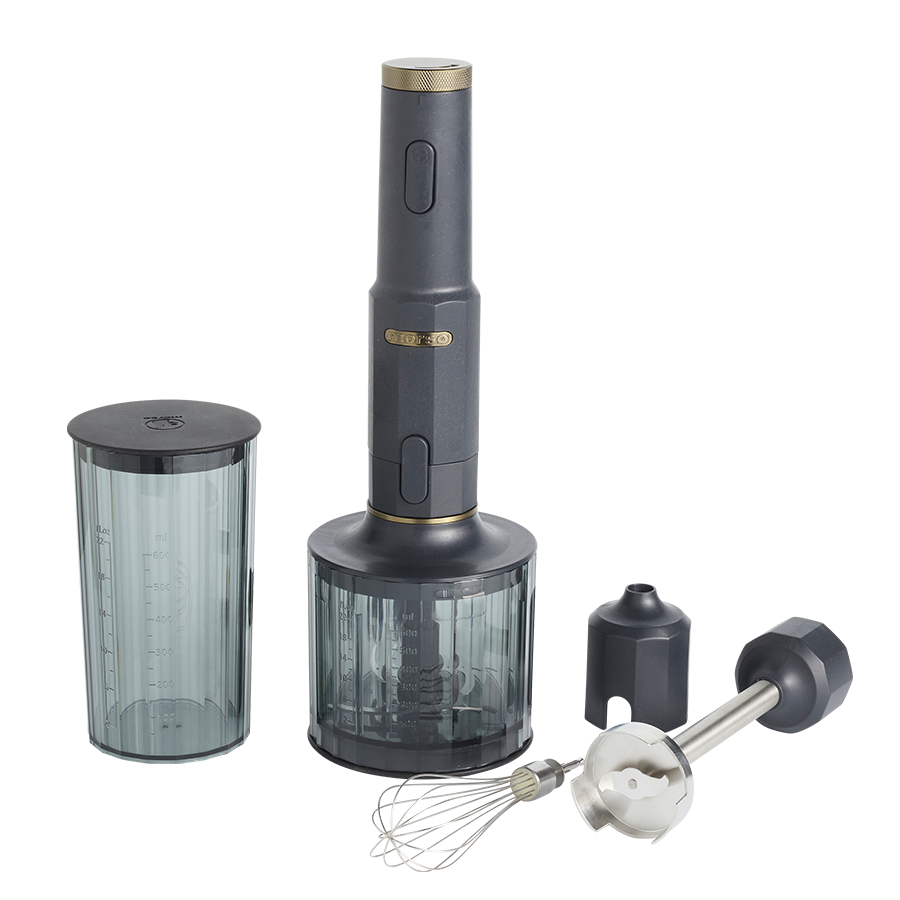 Striato stavblender med minihakker, blenderglas/målebæger og piskeris - 800 W. Striato stavblenderen udstråler luksus og tidløs elegance. Fremstillet i specialudviklet bioplast med kaffebønneskaller, der giver silkeagtig struktur og subtile farvevariationer, kombineret med dyb kulgrå tone og varme messingdetaljer. Serien forener Morsøs arv med moderne nordisk design og skaber maskiner, der er for smukke til at gemme væk – designet til at blive brugt og set i hverdagen.