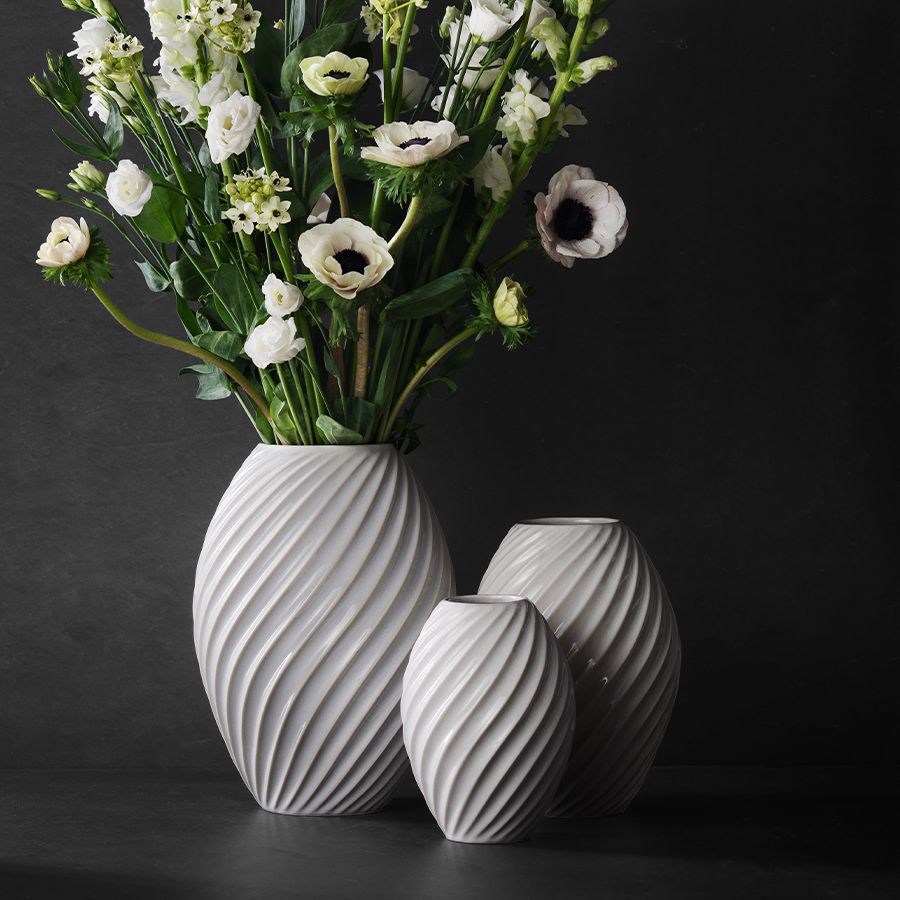 Som lette krusninger på vand snor det smukke diagonale spiralmønster sig elegant om de slanke vaser og giver dem et spændende stramt, grafisk udtryk. Vaserne er udført i porcelæn og glaseret med en smuk blank kithvid glasur, der på flotteste vis understreger vasens form. Vaserne findes i 3 klassiske størrelser, der er tilpasset roser, afskårne blomster og forårsgrene.