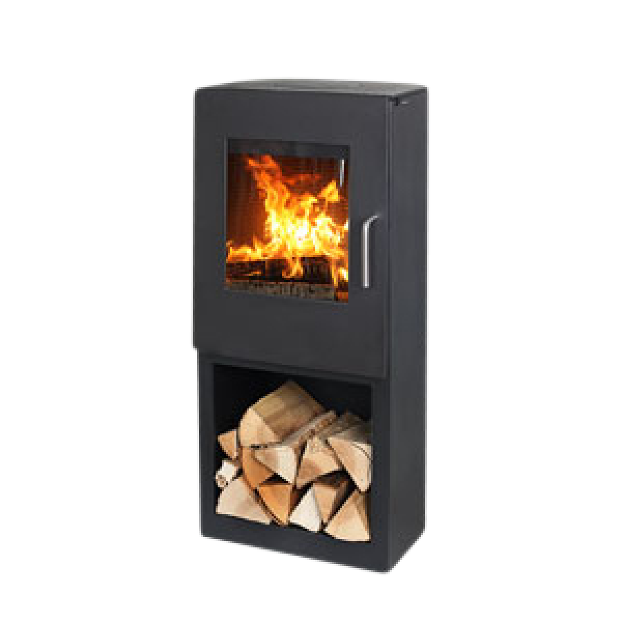 Som en ekstra funktionel effekt fungerer det rummelige brændemagasin også som dekoration i smukt samspil med ovnens store flammebillede.