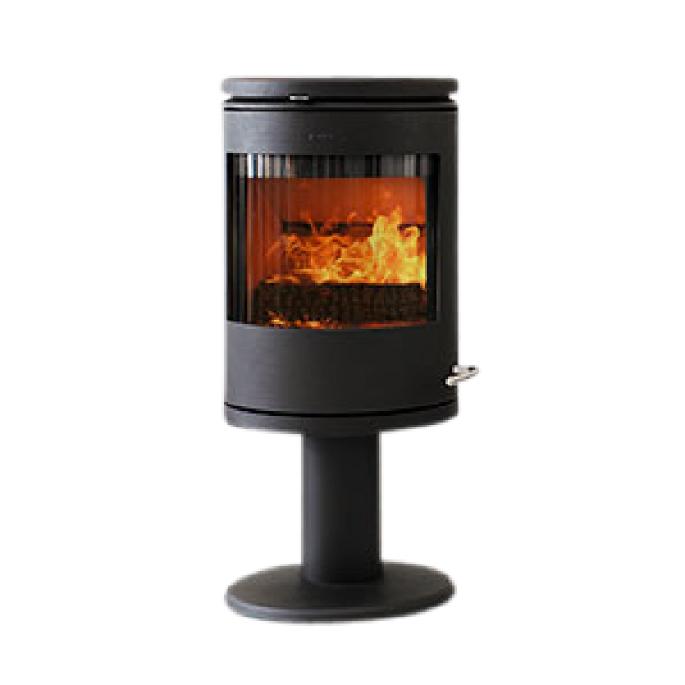 Kaminofen auf gusseisernem Sockel und mit großer Glasfront, die einen uneingeschränkten Blick auf die Flammen erlaubt.