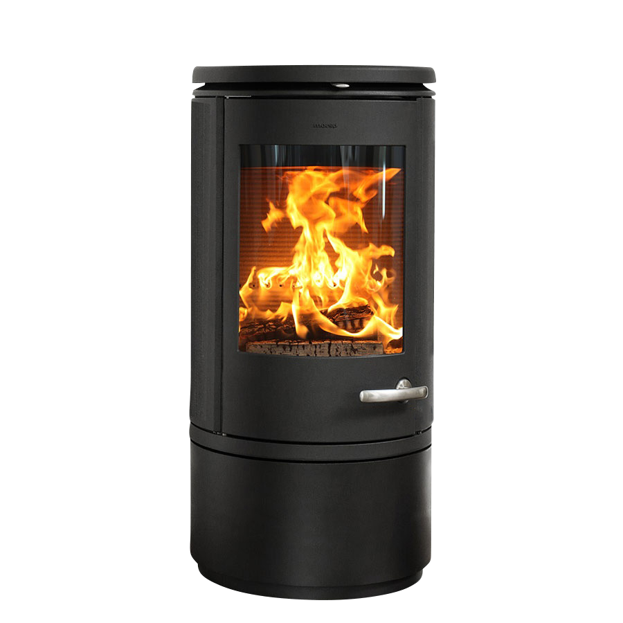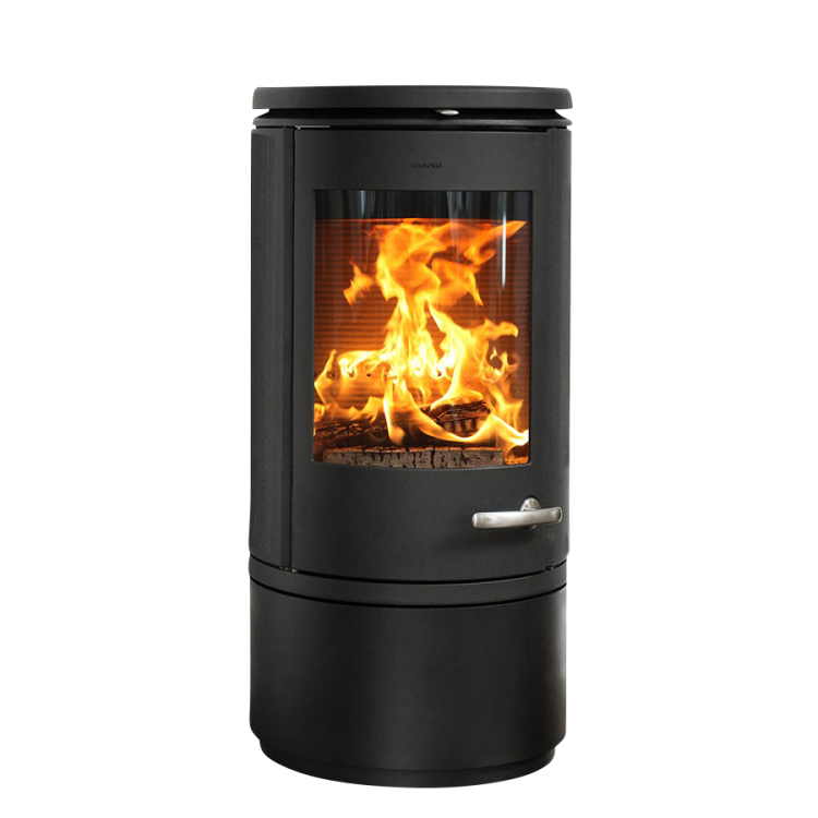 Die besonderen Details dieses Ofens – wie der Griff aus nicht rostendem Stahl – bilden einen Kontrast zu dem mattschwarzen Gusseisen. Die große Glasfläche gewährt Ihnen einen guten Blick auf die Flammen und das moderne Design von Monica Ritterband passt zu designbewusster Inneneinrichtung.