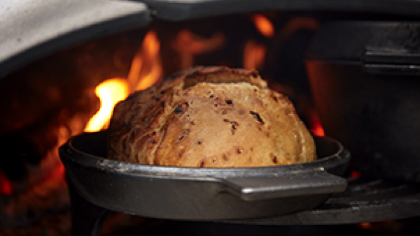Wenn der Teig fertig gegangen ist, wird er hinüber in den warmen Topf gewendet. Der Teig darf den Topf nur zur Hälfte ausfüllen. Stellen Sie die Cocotte mit aufgesetztem Deckel in den Forno. Überzeugen Sie sich, dass der Ofen heiß genug ist.