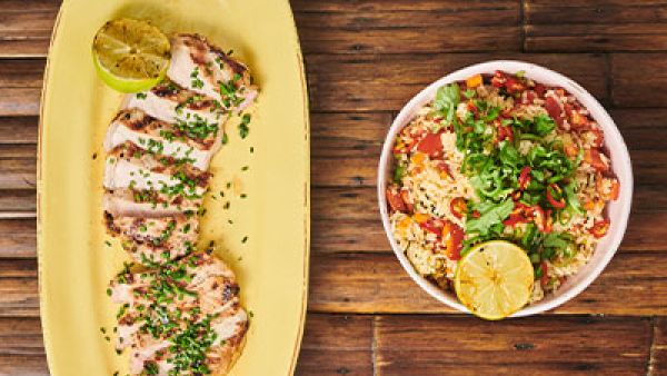 Gegrillte Schweinekoteletts mit gebratenem Reis und Gemüse