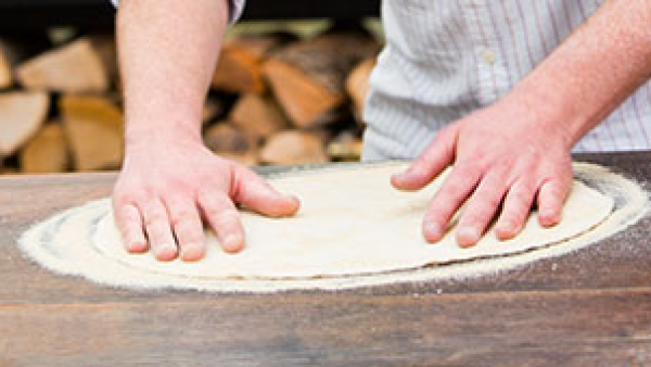 Nehmen Sie den Teig aus dem Kühlschrank und schneiden Sie ihn in Kugeln von ungefähr 160 Gramm. Kneten Sie die Kugeln rund. Legen Sie die Teigkugeln auf ein Tablett und stellen Sie sie eine Stunde lang kalt (am besten im Kühlschrank).