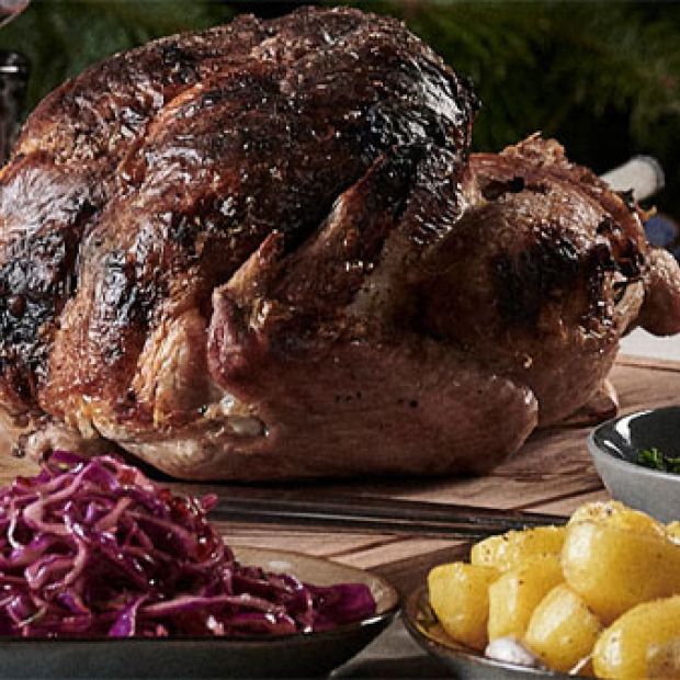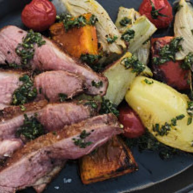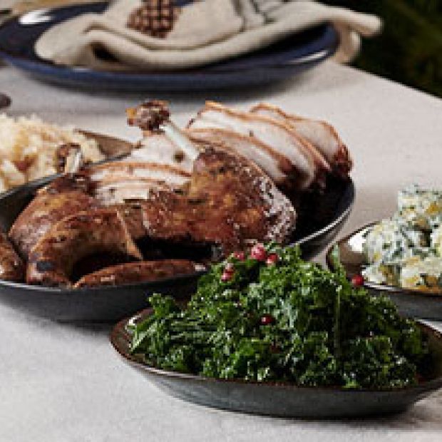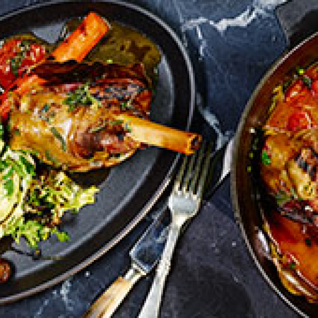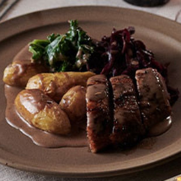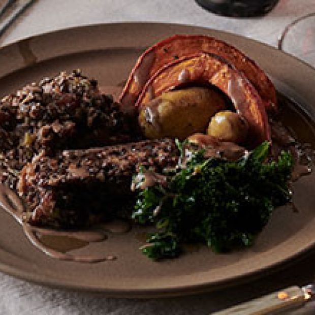Lammkeule mit Apfel-cidre, Kohl und Pilzen