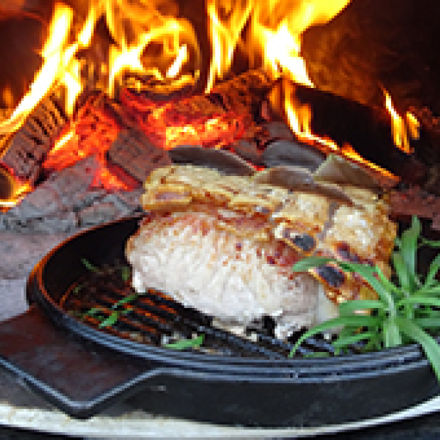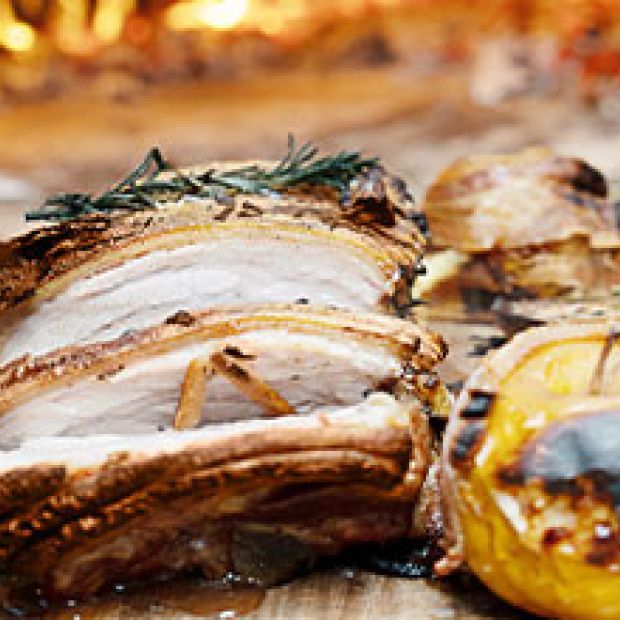 Ribbensteg (Schweinebraten) mit roten Zwiebeln, Äpfeln und Speck