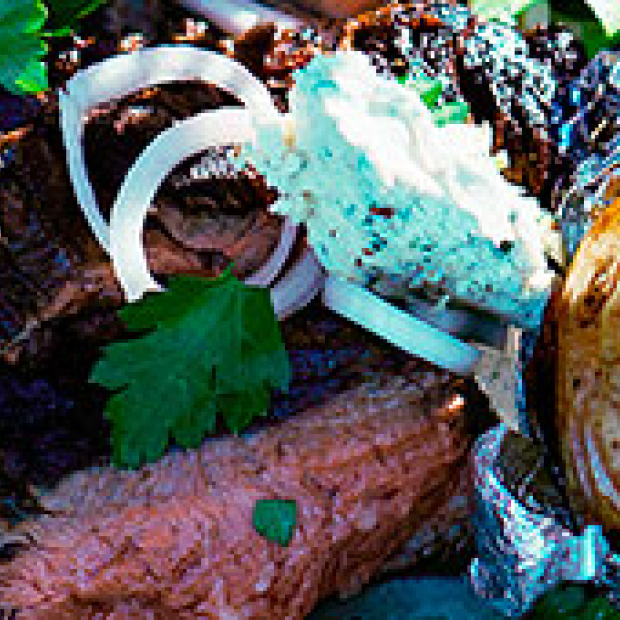 Gegrilltes Steak aus der Flanke und gebackene Kartoffel mit Trüeffelbutter