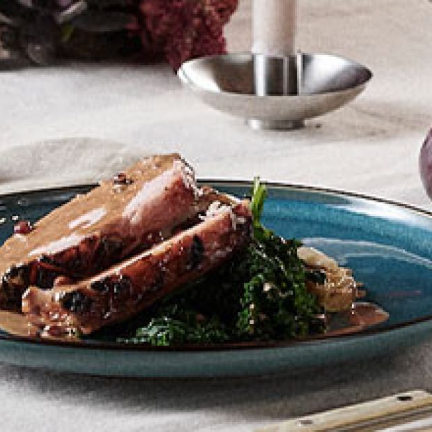 Lamm vom Grill mit Kohl, Zwiebelpüeree und Portweinsauce