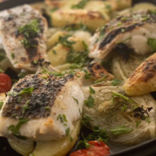Im Ofen gebackener Seehecht mit Fenchel, Kartoffeln und Cherrytomaten