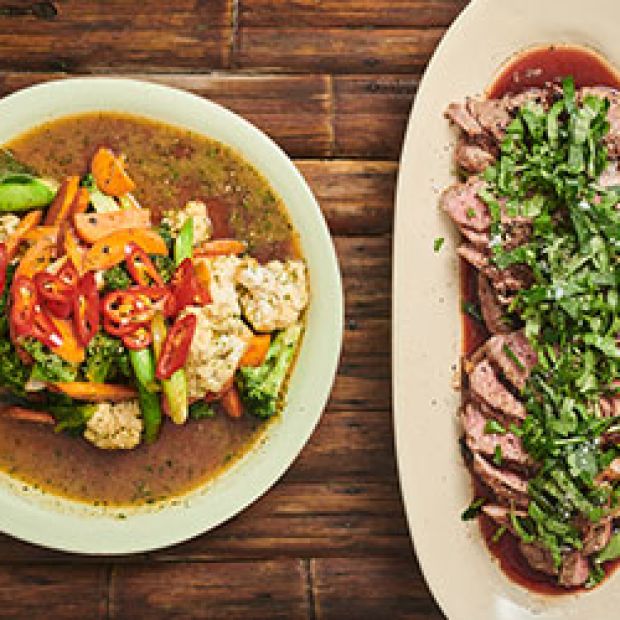 Gegrillte Steaks mit Gemüse in Austernsauce