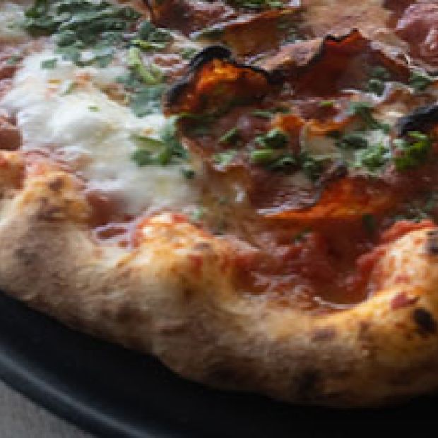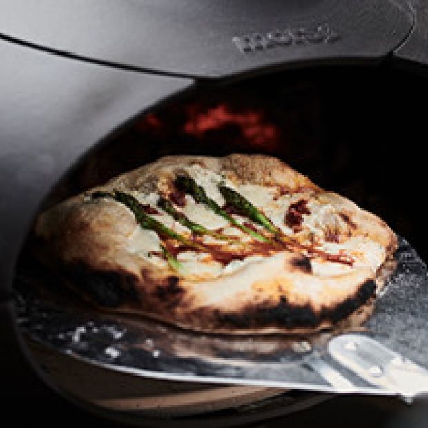 Pizza mit Spargel, Nduja, Mascarpone, Mozzarella und Thymian