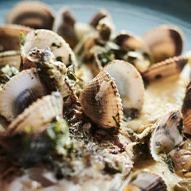 Gegrillter Wittling mit Herzmuscheln, Mash und Salsa Verde