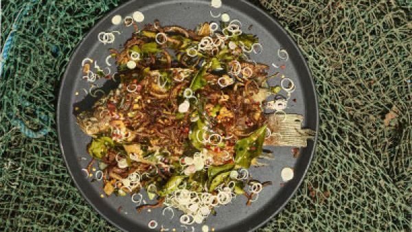 Alles herausnehmen, dann den Wok mit Öl auf höchster Stufe erhitzen. Sicherstellen, dass das Öl richtig heiß ist (ca. 175 bis 190 Grad), bevor der Fisch frittiert wird. Der Fisch ist fertig, wenn er golden und knusprig ist. Zum Servieren den Fisch mit der Sauce übergießen und die frittierten Beilagen und das feingeschnittene Zitronengras darüberstreuen.
