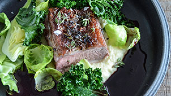Lamm vom Grill mit Kohl, Zwiebelpüeree und Portweinsauce