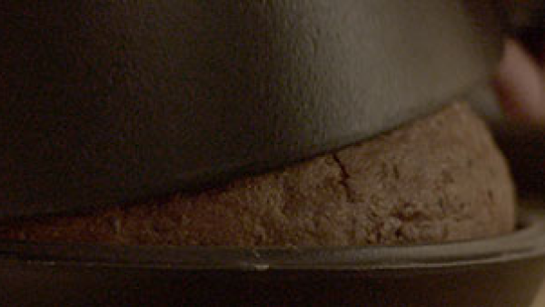 Die Kokotte dann herausnehmen, den Boden mit Roggenmehl bestreuen und den Teig hineingeben. Den Teig ebenfalls mit Roggenmehl bestreuen und die Kokotte mit dem Deckel wieder in den Ofen stellen.