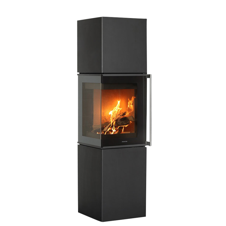 The spectacular glass door, exposing the view of the flames to the side and front, is easy to open and close with its elegant handle, designed as an integral part of the door. The automatic closing system ensures the door shuts tightly with suction you can barely hear.