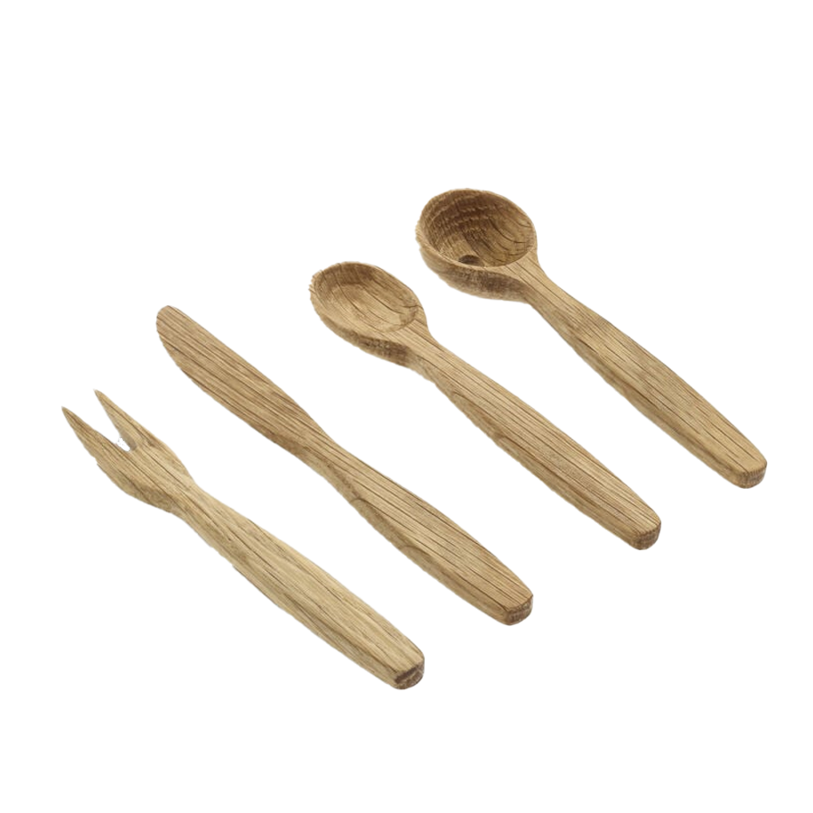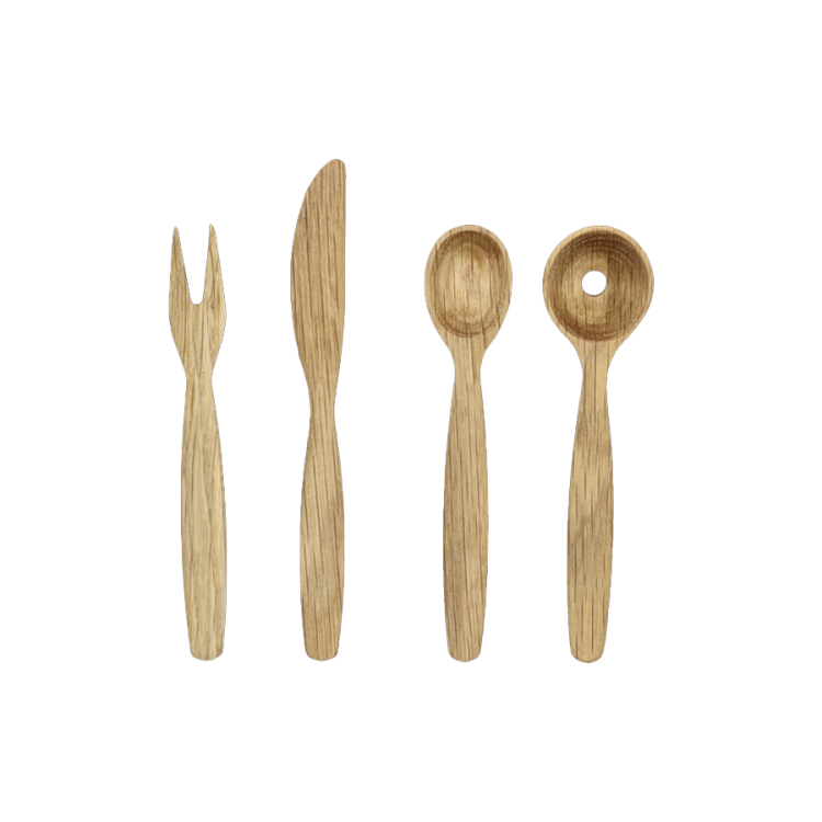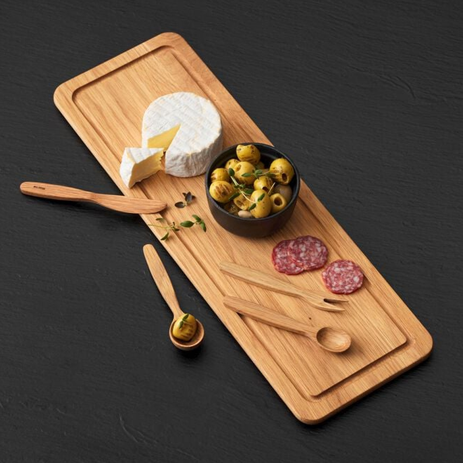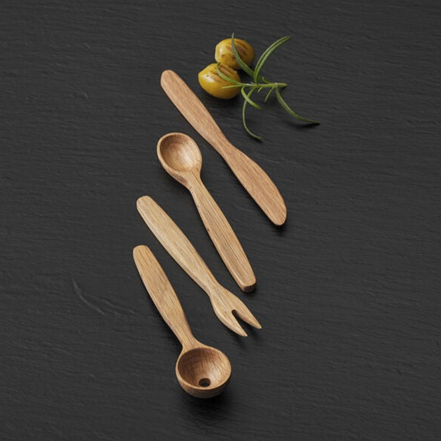 This stylish tapas set prepares the ground for enjoyably mouth-watering hours spent in the company of friends and family. The set comprises an olive spoon, an ordinary spoon and a stylish fork, all 14 cm in length, plus a 16 cm knife. Wash in warm water and a mild soap. Is not dishwasher safe. It will be an advantage to subject the set to regular subsequent treatment with cooking oil once or twice a year. The product is made of FSC® certified oak (FSC-C166612).