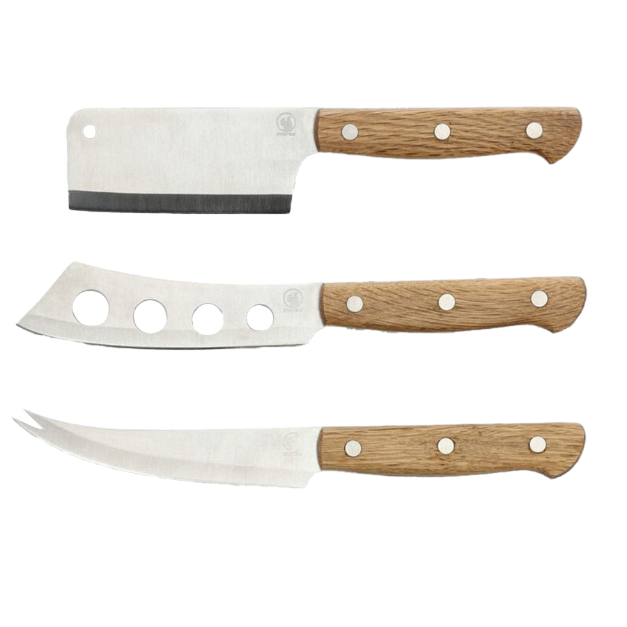 This set of three cheese knives is the perfect equipment for the cheeseboard. The blades are made of stainless quality steel and the handles of oiled oak which, in use, will develop patina and simply become more beautiful the longer the knives are used. Shaped from one piece of wood, the wooden handles are comfortable to hold. Wash in hot water and mild soap and dry immediately. Not suitable for dishwasher. The wooden part of the product is FSC® certified oak.