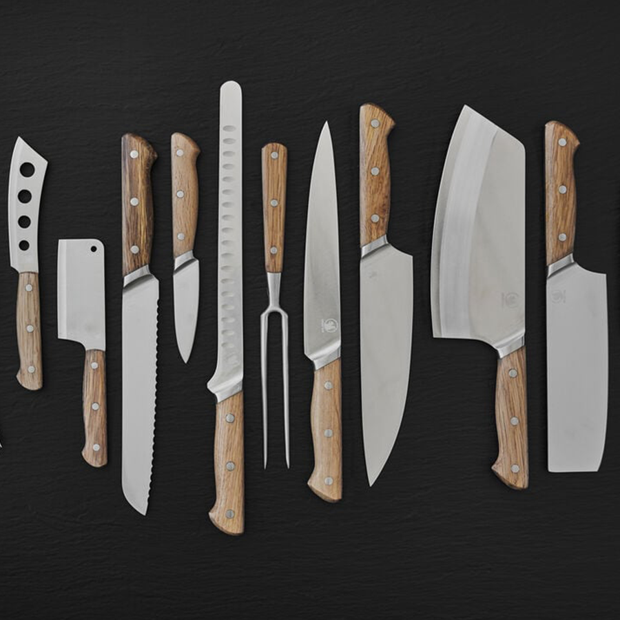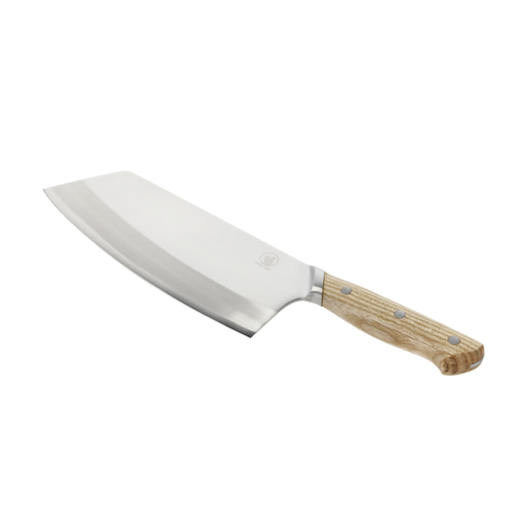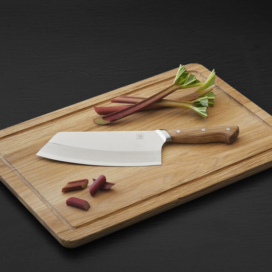 The large stainless steel meat cleaver with oak handle is suitable for cutting and chopping large pieces of meat into smaller pieces, and can also be used to tenderise meat, crush garlic and chop vegetables. Wash with warm water and mild soap and dry immediately. Not suitable for dishwasher. The wooden part of the item is FSC®-certified oak (FSC-C166612).