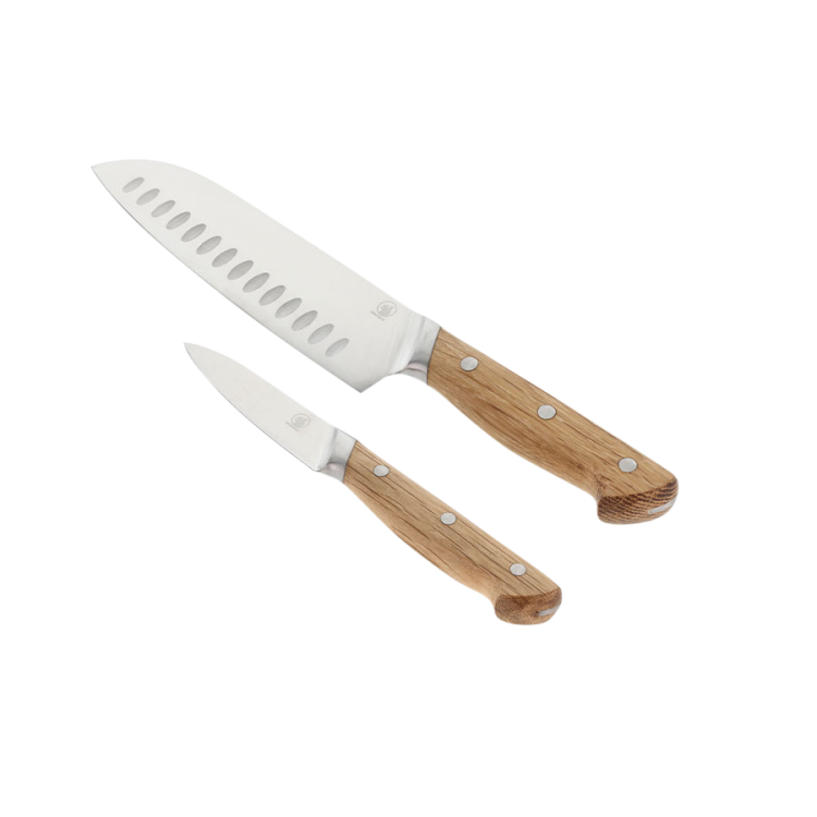 The Santoku knife and herb knife are great, versatile partners in this kitchen knife set. The blades are made of high-quality stainless steel and the handles are made of oiled oak, which will develop a patina over time and become more beautiful the more you use the knives. The wooden handles are made of a single piece of wood and are comfortable to hold. The Santoku knife has a scalloped edge, which prevents the food from sticking to the blade. Wash with warm water and mild soap and dry immediately. Not suitable for dishwashers. The wooden handle is made of FSC®-certified oak (FSC-C166612).