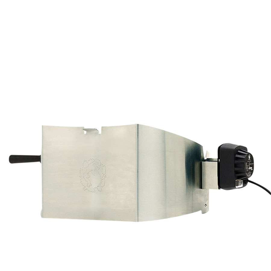 In general, a rotisserie for a grill is solely intended as a functional expansion. Not so for Morsø, however... Function-wise, the rotisseries for Morsø’s popular Morsø Forno Gas Grande og -Medio are designed to supplement the grill’s original characteristic and simple design. The maintenance of the overall design profile whilst at the same time securing optimal quality and functionality was an indispensable requirement for Morsø as for the designer, Klaus Rath. The beautifully curved screen in stainless steel elegantly wedges itself under the lid of the grill, thus establishing ample room for the rotation of even considerable quantities, just as there is room for a meat-juice collector between the rotator and the grilling core. An even rotation thus facilitates the easy and simple achievement of a beautifully, deliciously and uniformly grilled product. When using the rotisserie, the heat levels of the grill are reduced slightly. The rotisserie is easily cleaned, and all steel parts are dishwasher proof.