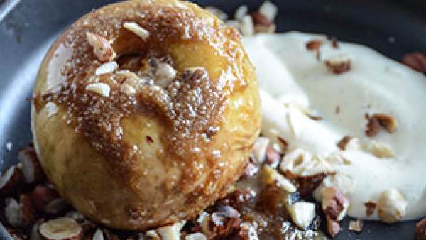 Arrange the baked apples on a plate with the toasted hazelnuts and crème fraîche.